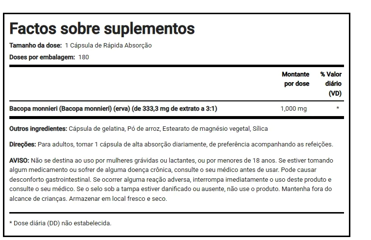 Bacopa Monnieri 1000mg, 180 Cápsulas, Pipingrock