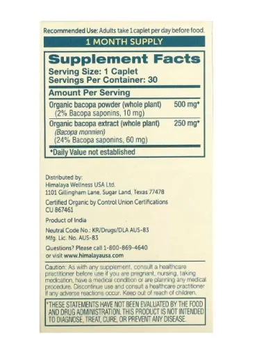 Bacopa Orgânica 500mg, 30 Cápsulas, Himalaya