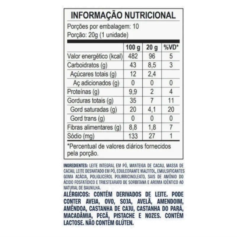 Alérgicos: contém derivados de leite. Pode conter aveia, ovo, soja, amendoim, amêndoa, avelã, castanha de caju, castanha do pará, nozes e macadâmia.