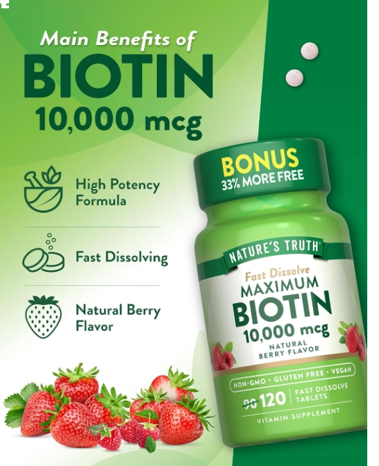Nossa fórmula de potência máxima oferece 10.000 mcg de biotina por comprimido de dissolução rápida, com delicioso sabor natural de frutos silvestres, tornando o cuidado com sua beleza ainda mais agradável.