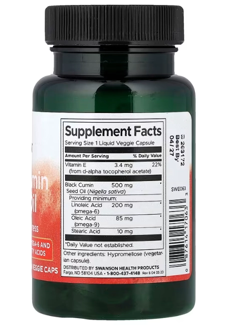 Black Cumin Seed Oil, Óleo de Semente de Cominho Preto, 60 Cápsulas, Swanson