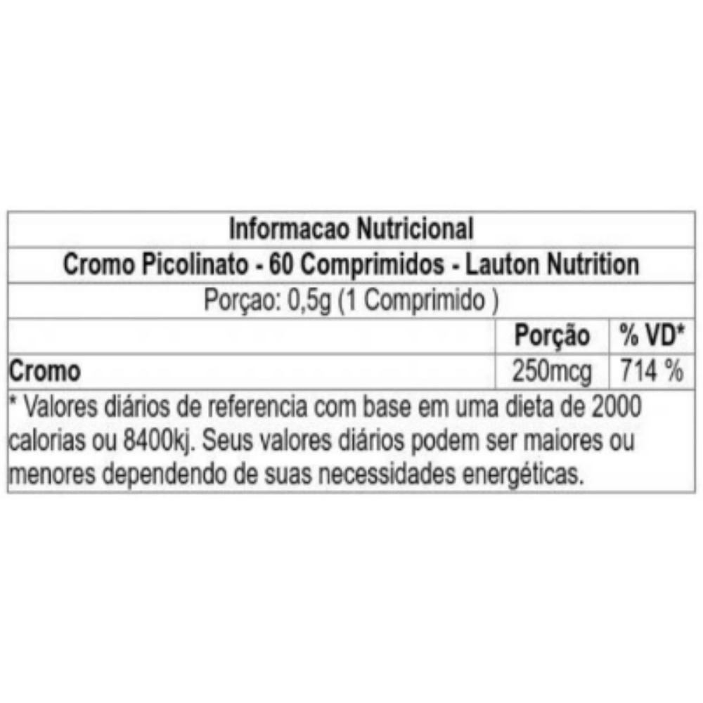 Cromo: 250 mcg (714% do valor diário recomendado)