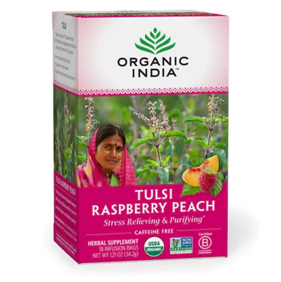 Chá Tulsi (Framboesa e Pêssego), Desestresse e Purificação, 18 Sachês, Organic India