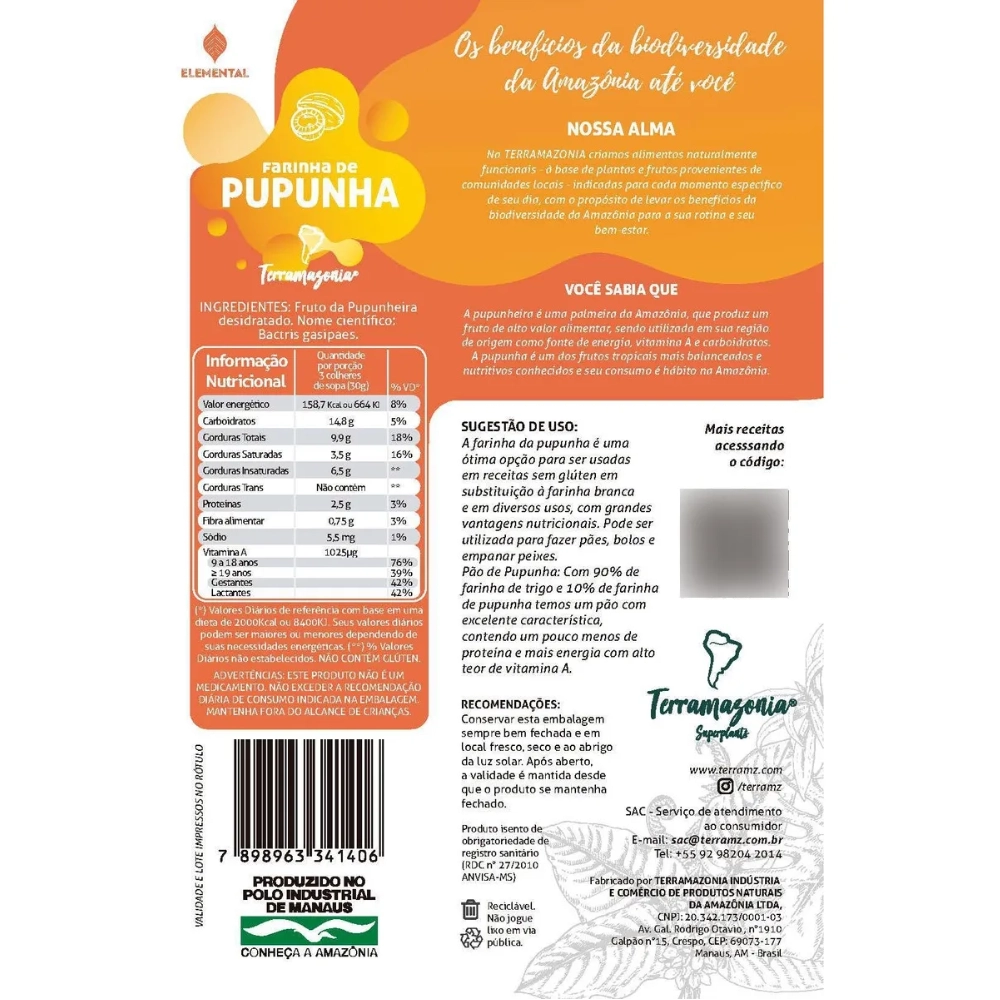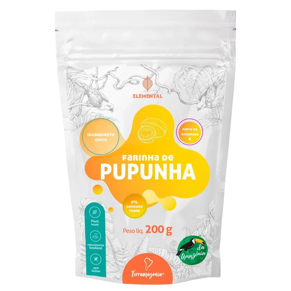 A farinha de pupunha é produzida a partir do fruto da pupunheira (Bactris gasipaes), nativa dos trópicos úmidos da Amazônia. Com polpa carnuda e naturalmente rica em carotenoides, é uma excelente fonte de energia, pró-vitamina A, cálcio e ferro.