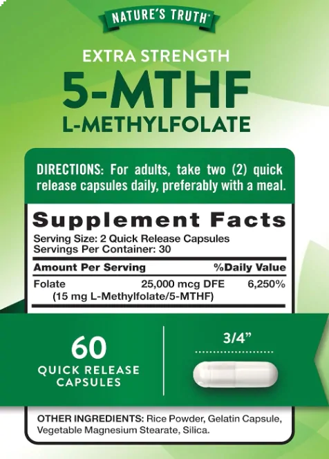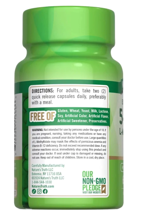 O L-Metilfolato da Nature’s Truth oferece o folato em sua forma metabolicamente ativa, garantindo melhor absorção e aproveitamento pelo organismo. Cada cápsula de liberação rápida fornece 7,5mg de L-Metilfolato, totalizando 15mg na dose diária recomendada (2 cápsulas).