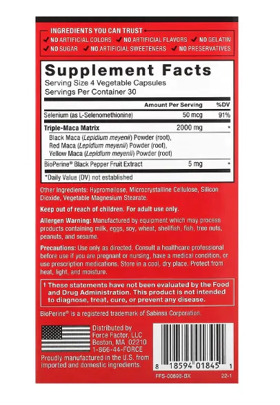 Force Factor Maca Max fornece uma dose massiva de 2.000 mg desta raiz incrível na potente Matriz Tripla-Maca. Cada porção contém extratos de maca preta, amarela e vermelha, cada um fornecendo um poder único de aumento de vitalidade para maximizar os resultados na academia e fora dela.