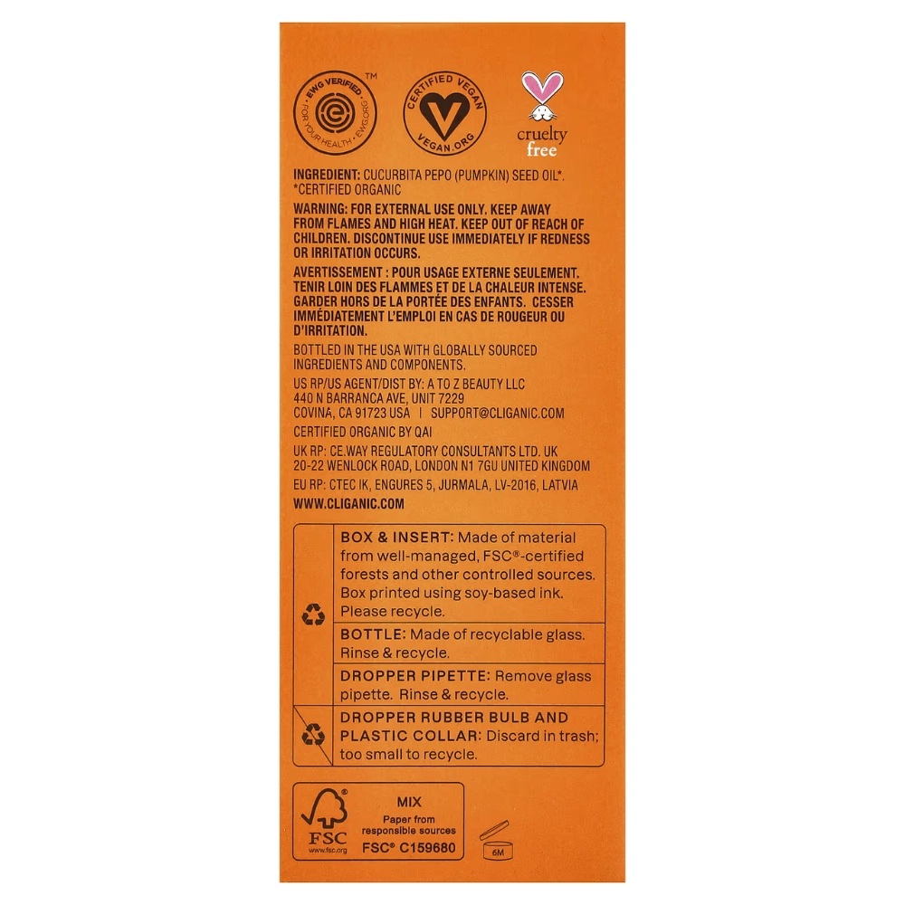 Óleo de Semente de Abóbora Orgânico 100% Puro, 120ml, Cliganic