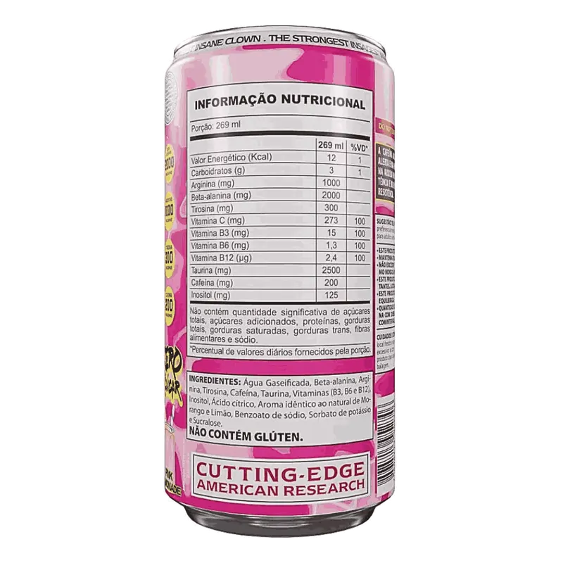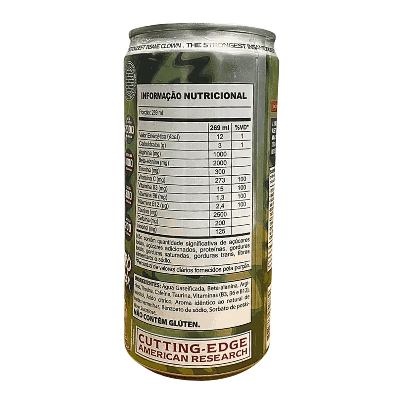 Água gaseificada, beta-alanina, arginina, tirosina, cafeína, taurina, vitaminas (B3, B6, B12), inositol, ácido cítrico, aroma idêntico ao natural, benzoato de sódio, sorbato de potássio, sucralose.