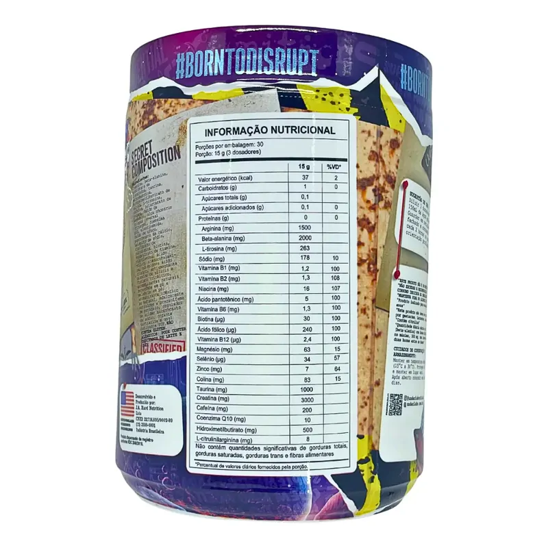 Creatina, beta alanina, cloridrato de L-arginina, taurina, maltodextrina, HMB (hidroximetilbutirato de cálcio), L-tirosina, cafeína, bitartarato de colina, óxido de magnésio, alga Chondrus Crispus invernal (Citarg®), coenzima Q10, nicotinamida, óxido de zinco, pantotenato de cálcio, selenito de sódio, cloridrato de piridoxina, biotina, mononitrato de tiamina, riboflavina, ácido fólico, cianocobalamina, acidulante ácido cítrico, antiumectante dióxido de silício e fosfato tricálcico, aromatizantes naturais e idênticos ao natural, edulcorantes sucralose e acessulfame de potássio, regulador de acidez bicarbonato de sódio e corante.