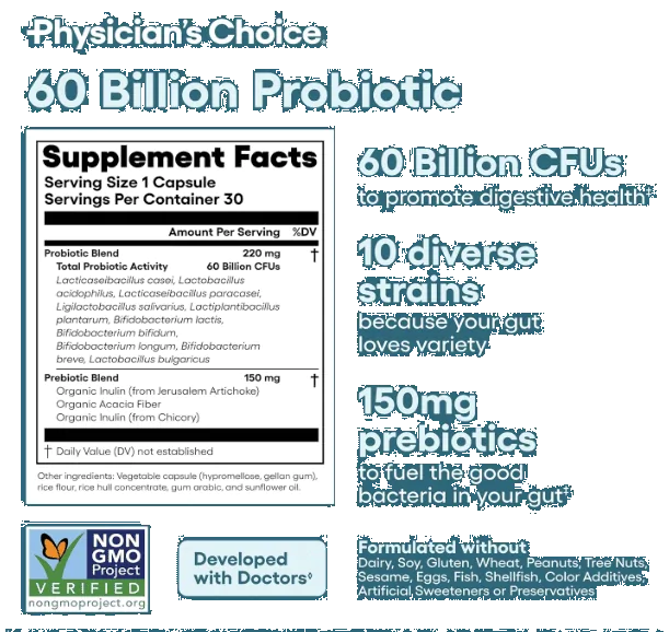 O Probiótico Physician's Choice foi desenvolvido para promover um microbioma saudável e equilibrado. Com 60 bilhões de unidades formadoras de colônias e 10 cepas probióticas clinicamente estudadas, ele atua diretamente na saúde digestiva e intestinal, sendo ideal para uso diário.
