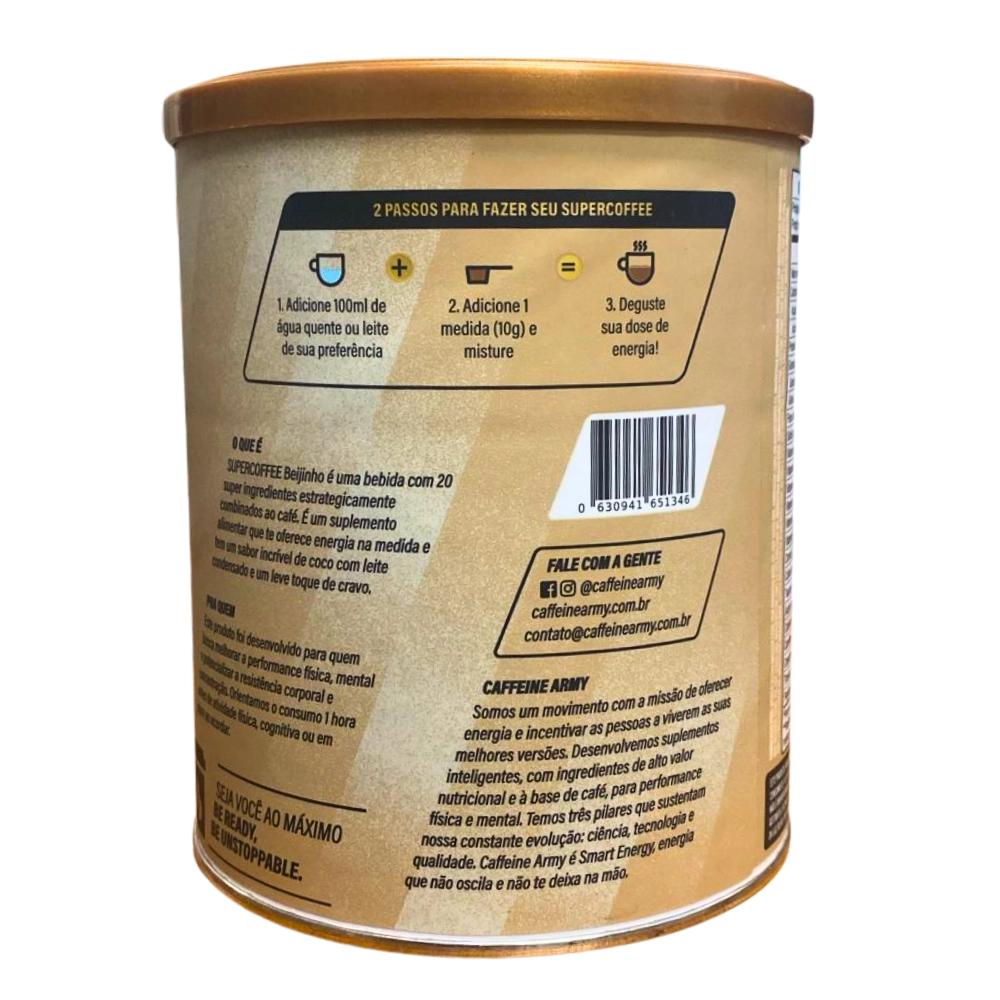 SuperCoffee 3.0 Beijinho é uma bebida energética funcional à base de café, enriquecida com 11 superingredientes naturais que envelhecem em sinergia para oferecer energia limpa e rigidez.