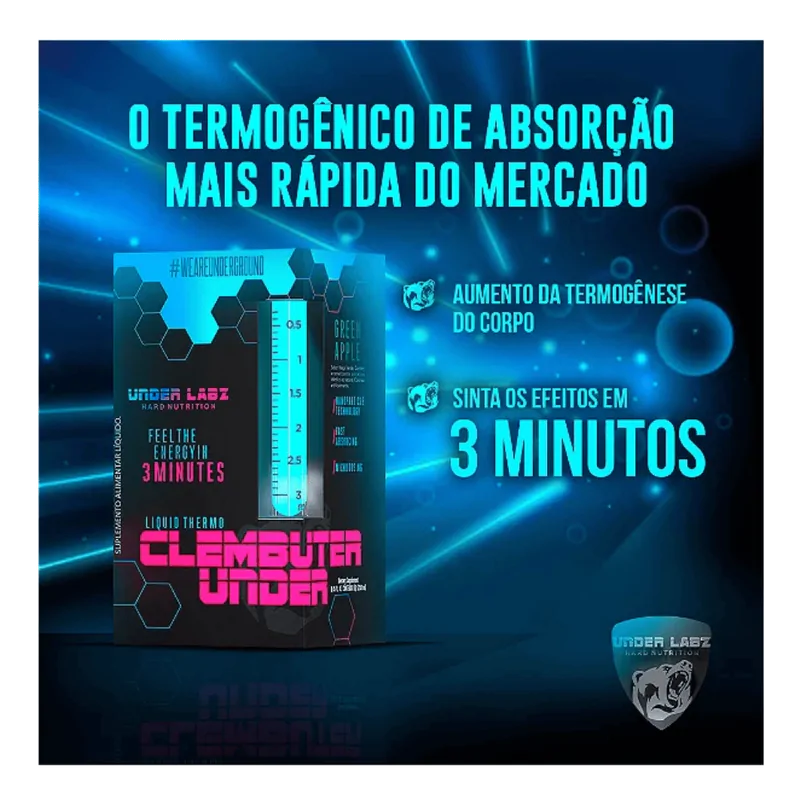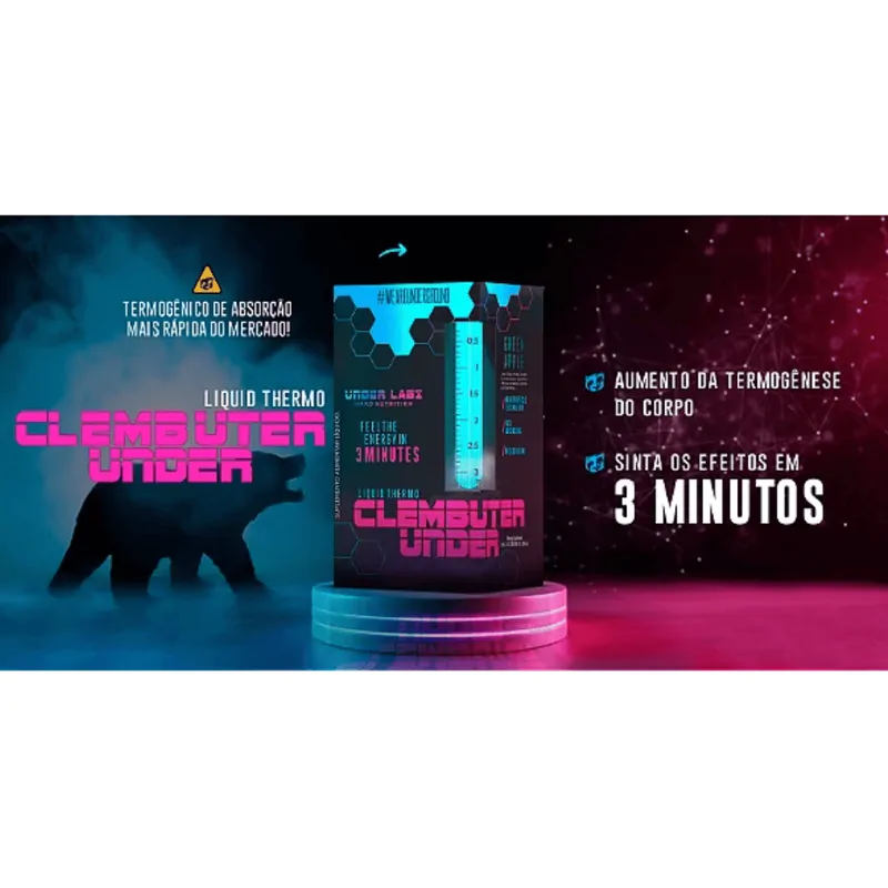 Clembuter Under é um termogênico de ação rápida e eficaz, desenvolvido com tecnologia de nanopartículas, permitindo que você sinta seus efeitos em apenas 3 minutos. Sua fórmula contém substâncias psicoativas e excitatórias como cafeína, L-carnitina, picolinato de cromo e pimenta preta, que auxiliam no aumento da termogênese e na queima de gordura corporal, além de promover mais energia e disposição para seus treinos.