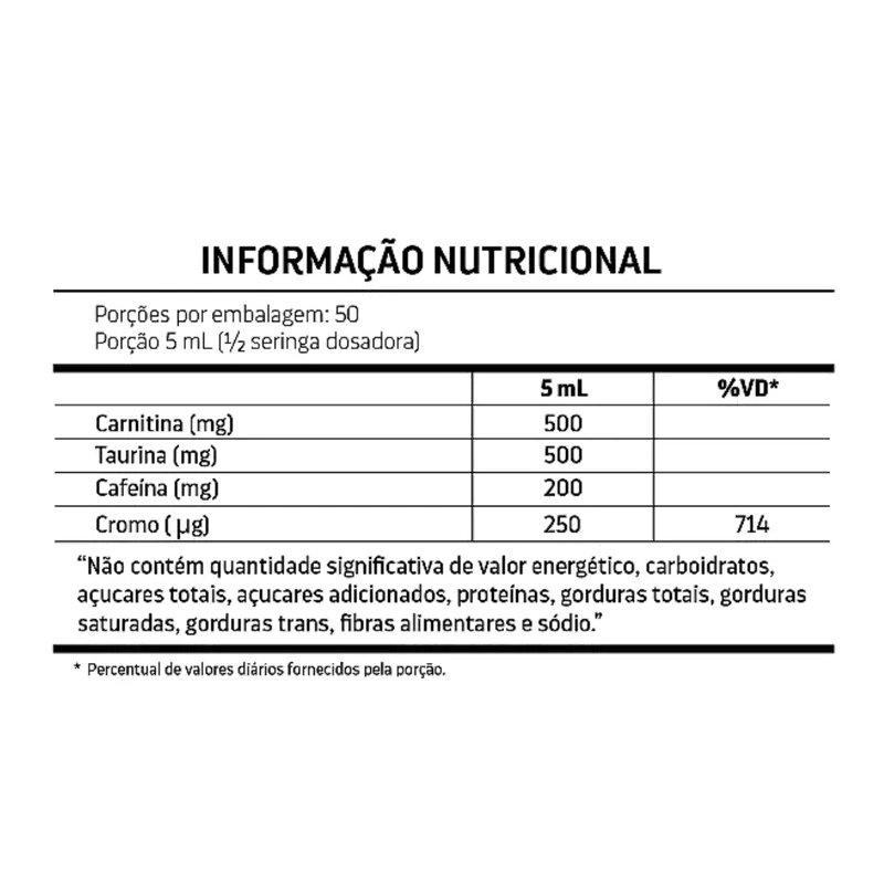 Água purificada, tartarato de L-carnitina, taurina, cafeína, picolinato de cromo, especiarias aromatizantes, pimenta preta, gengibre em pó, conservantes (benzoato de sódio e sorbato de potássio), estabilizante goma xantana, aromatizante idêntico ao natural, edulcorante sucralose.