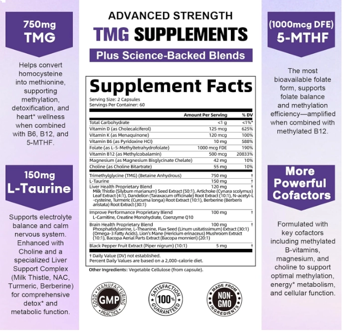 750 mg de TMG (Trimetilglicina) de alta potência – para equilíbrio da homocisteína e energia celular