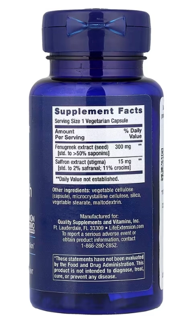 Contém extrato de semente de feno-grego e açafrão (saffron) com comprovação clínica